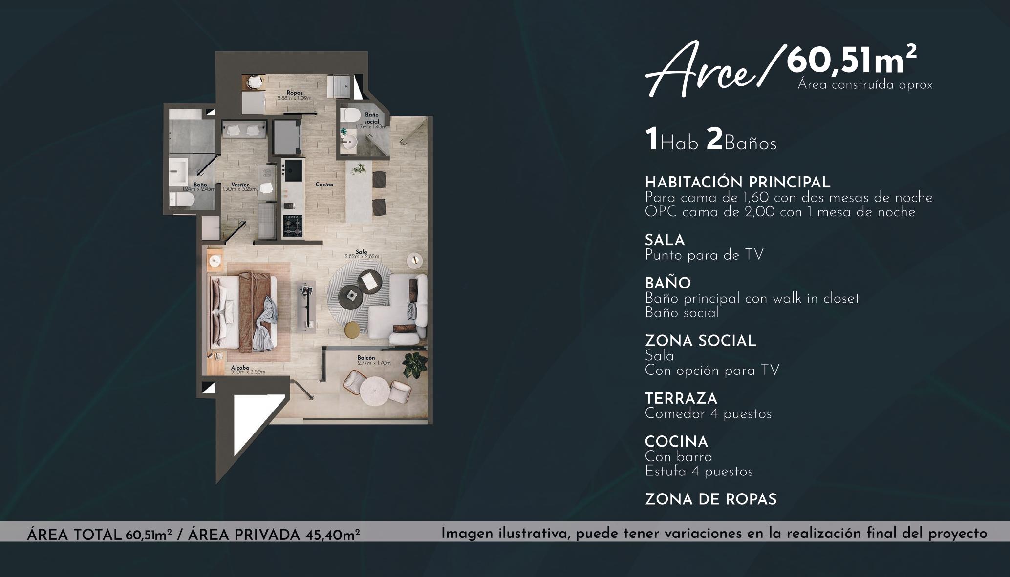 Conjunto cerrado, 1 torre de 16 pisos con ascensor. Apartamentos de 1 – 2 – 3 habitaciones.