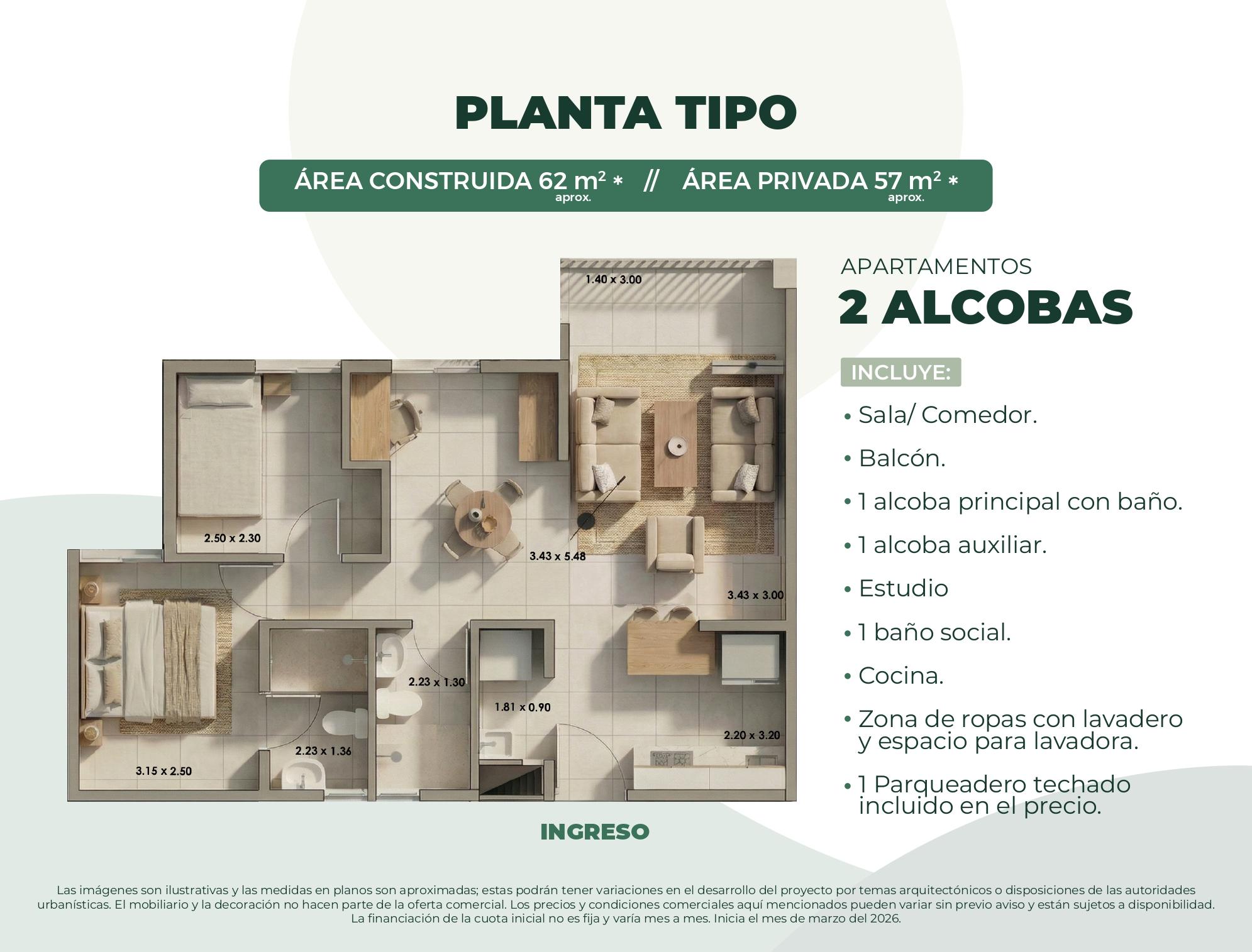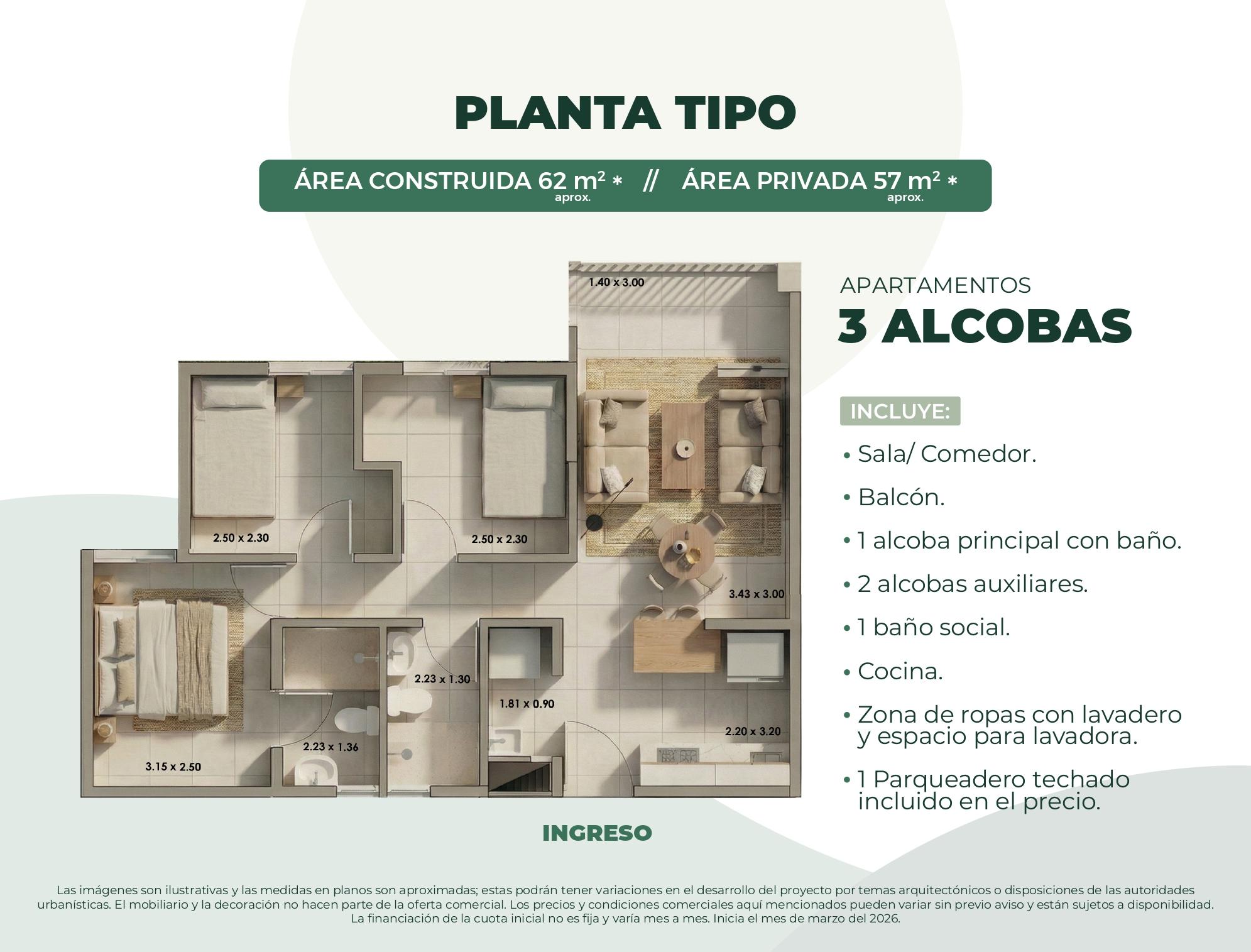 Conjunto cerrado, 1 torre de 11 pisos con ascensor. Apartamentos de 3 alcobas y 2 baños desde 62 m². Entrega en el segundo semestre del 2028.